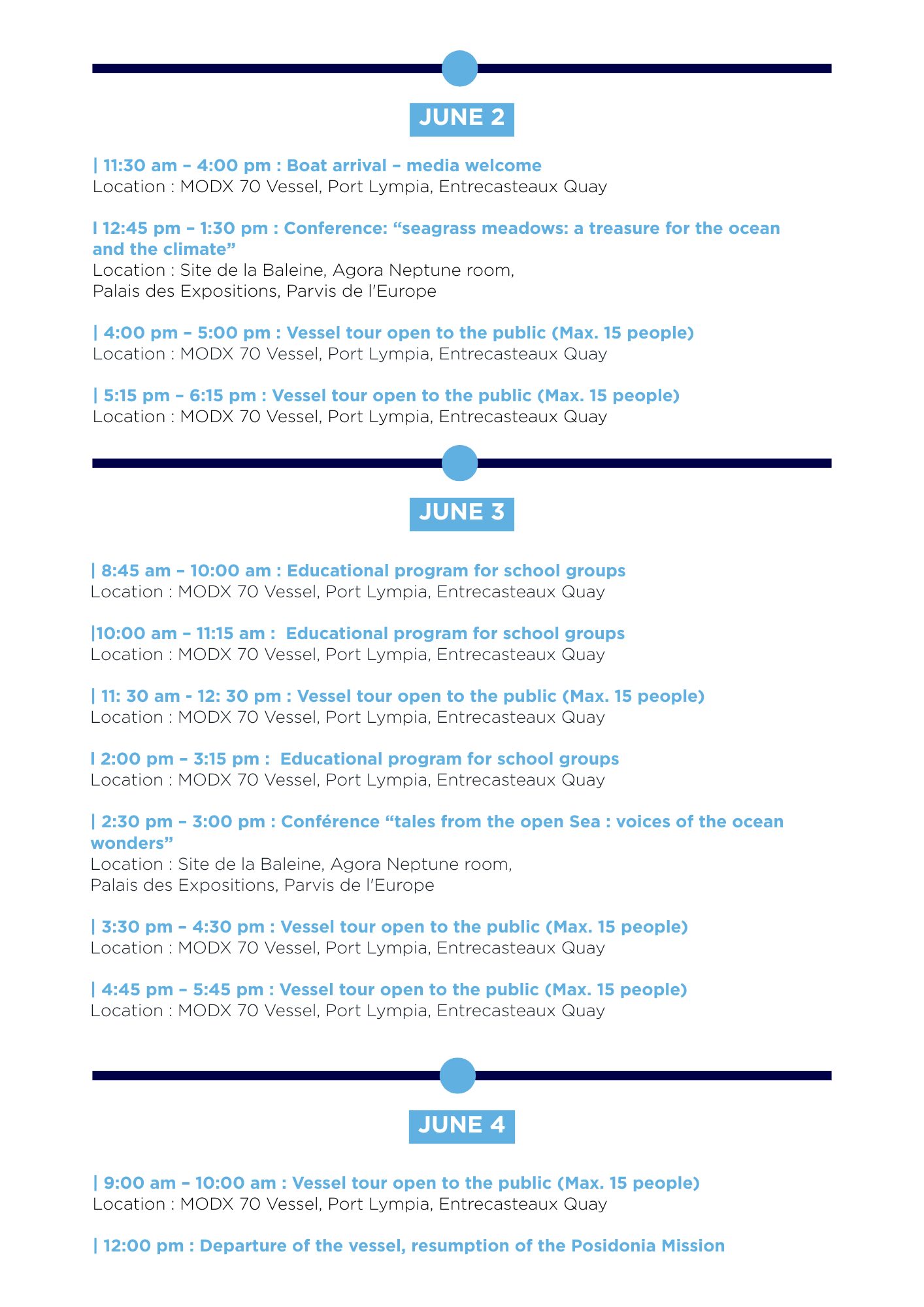 Two free conferences open to the general public will also be held to raise awareness and mobilize support for ocean preservation. They will be held at the Palais des Expositions, renamed ‘La Baleine’, for this occasion, and entirely dedicated to raising public awareness about the Ocean.