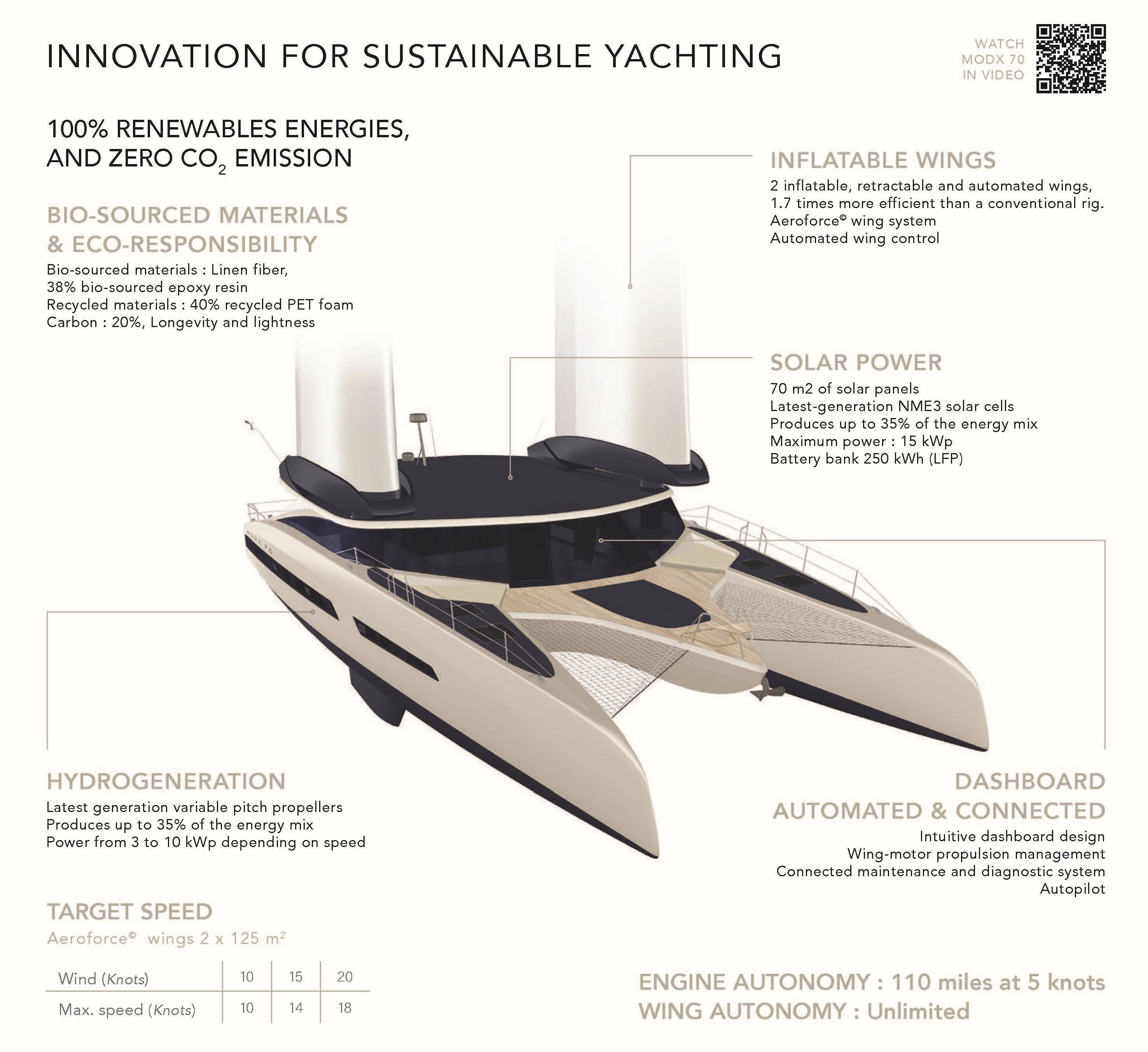 This zero-emission, noise-free catamaran, designed by Océan Développement, is not just any boat. Designed and built in France by passionate experts, the MODX 70 embodies a new way of sailing, clean, efficient, and committed.