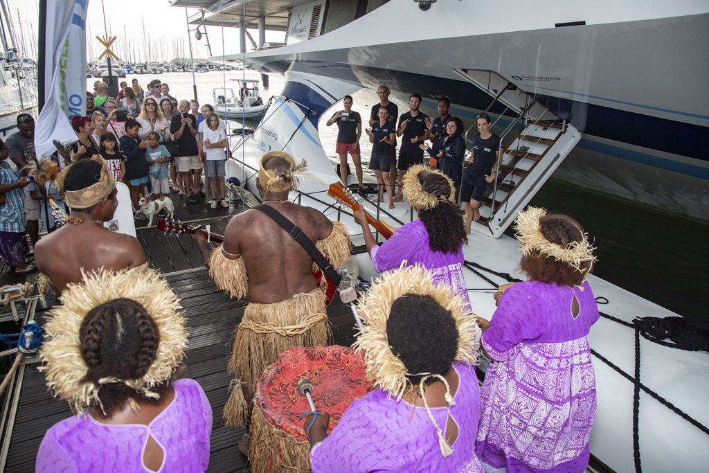 Race for Water and her crew (Annabelle Boudinot, second in command - Anne Le Chantoux, sailor - Margaux Chalas, steward - Basile Prime, engineer - Pascal Morizot, Captain) has just moored in Port Moselle (Nouméa), with a rousing welcome from a large crowd and the We Ce Ca group.