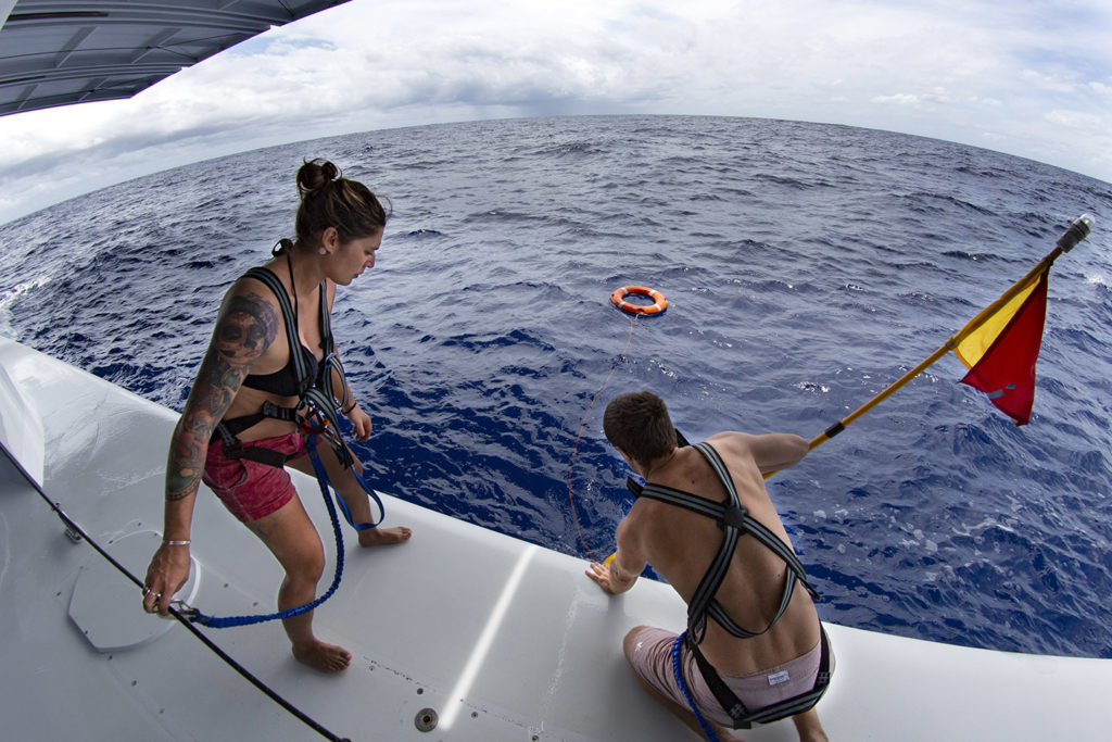 As the weather is a little cloudy and is likely to remain the same tomorrow, our attention turns to the energy. A little less air conditioning, but not too much… so it’s hot aboard Race for Water! Each time you go down into the floats, you work up a good sweat. The reward for very calm weather: we treat ourselves to a quick ‘dip’ in the afternoon!