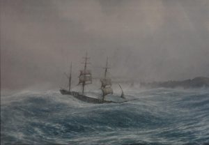 A painting by John Chancelor of the little English three-master River Boyne in 1875 with a solid fuel stove at Cape Horn