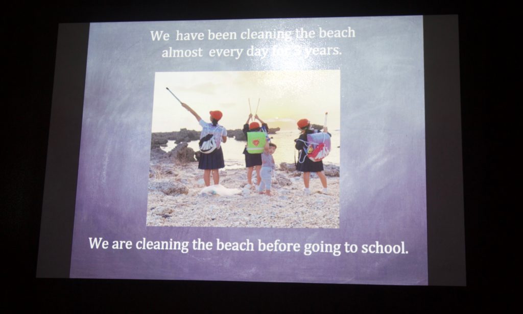 We set off for our meeting with the SAO family. In a room we found Lili, Hana and Mei accompanied by their little brother, their parents and Taeko our translator. Over twenty minutes, and with the aid of a PowerPoint, the girls presented their initiative to us: “Beach Clean Up on the way to school”!