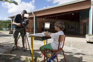 As we creep into this little school enveloped in lush greenery, someone tells us where we can find the class. Having barely set foot inside, Peter unpacks his gear, sets up his video camera and films the children. There isn’t a sound and the children look at us in stunned amazement, slightly uncomfortable about this morning intrusion. Midway through her lesson on ‘marine advice’, the teacher smiles and then explains how the lesson will play out: “Twice a week, we discuss the action we wish to undertake on our beach in order to preserve this fragile ecosystem”, explains Yanni Bardail, Director of the school and Head of the class.