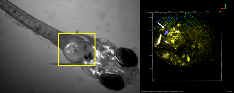 All fish larvae were fed a mixture of microplastics and food. Images taken with a biphotonic microscope confirmed that these larvae ingested the microplastic along with their food. In the image below, microplastics appears in blue and the food in yellow in the digestive tract of the larvae.