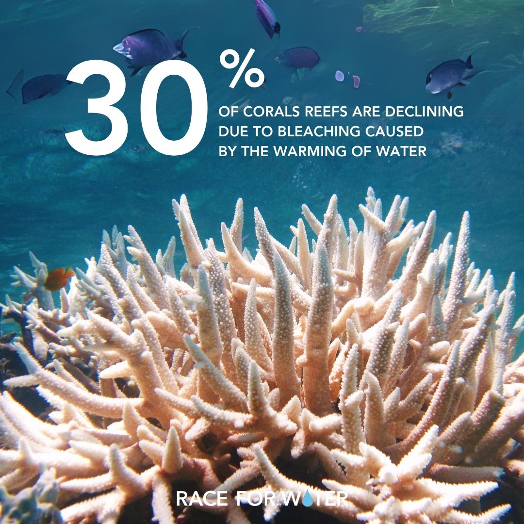 - 30% of coral reefs are in decline due to bleaching caused by warmer water (UNEP).