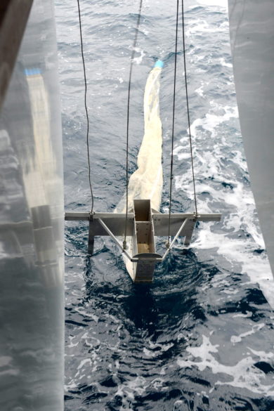 Pour la deuxième mission qui consiste à estimer l’abondance des microplastiques en eaux de surface, un filet particulier amené par Diego est utilisé, c’est le filet « AVANI ». Grâce à sa forme particulière, il peut être utilisé à une vitesse de plus de 4 nœuds permettant ainsi de ne pas arrêter le navire qui navigue à cette vitesse moyenne.