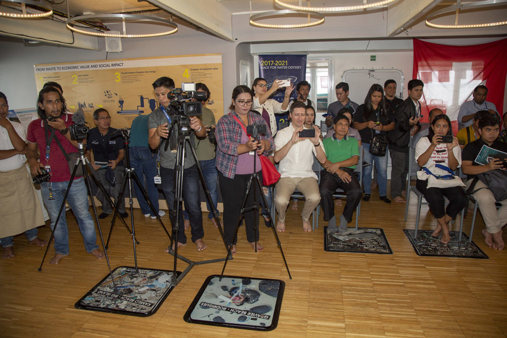 This unique catamaran arrived in Puerto Princesa on Tuesday 17th September and today hosted the official welcome press conference on board attended by the Race for Water crew; the Swiss Ambassador to the Philippines Mr. Alain Gaschen, and key guests and government officials at both a local and national level.