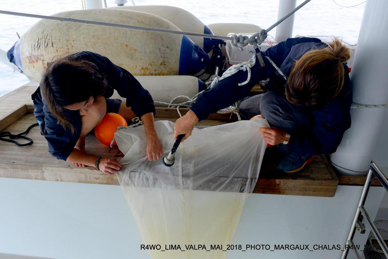 During the passage across the South-East Pacific Ocean from Concepción to Tahiti, regular samples of surface plastic particles have been taken by the crew within the context of the “Plastisphere” project. Indeed, the areas of plastic accumulation in the open ocean, such as in the subtropical gyre of the South Pacific, are making it possible to develop a new ecosystem: the plastisphere.