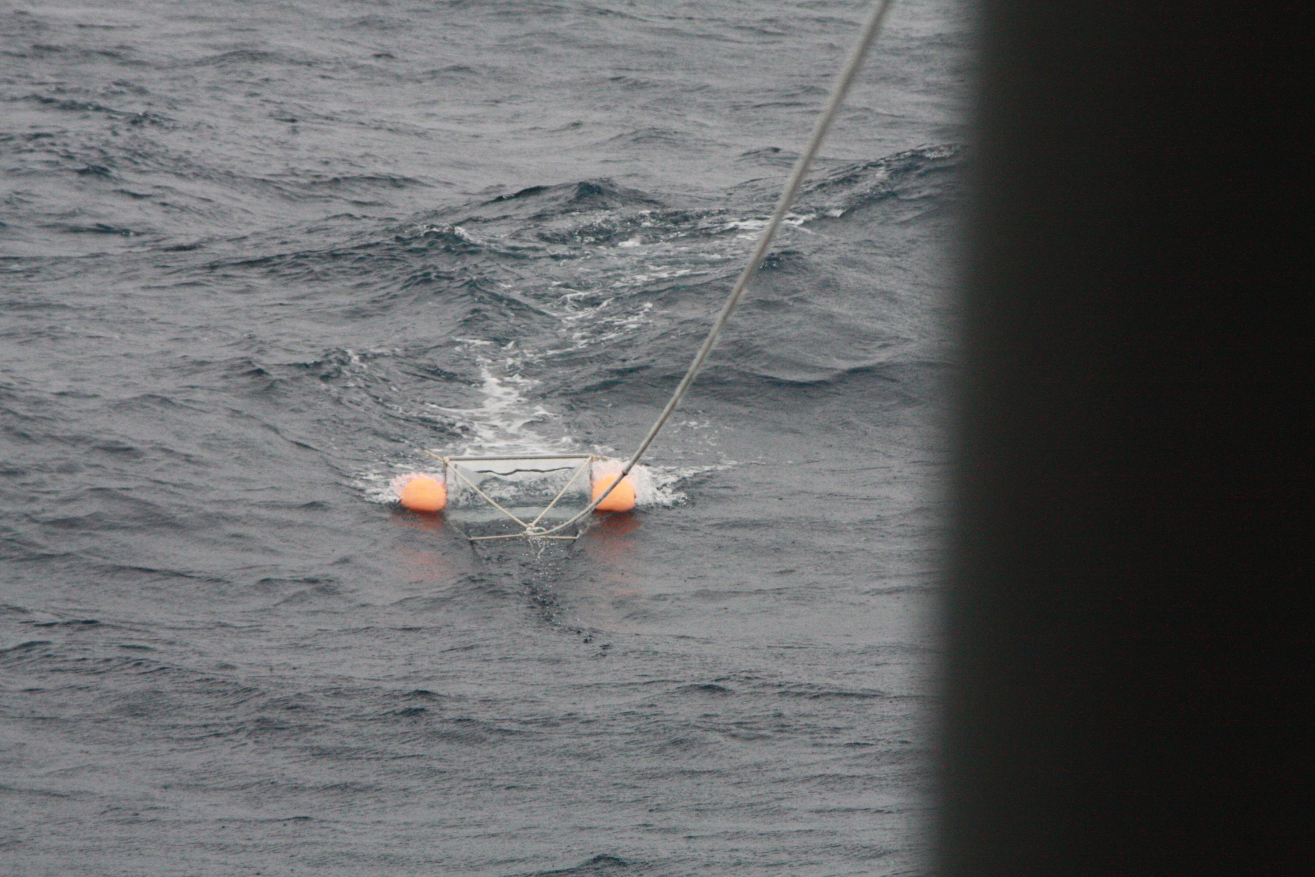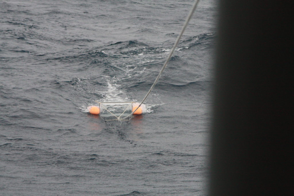 - The net was lift out of the water and rinsed with seawater after every tow to ensure that all material collected in the net is transferred into the cod end (located at the end of the net, picture in the top right). The net and cod end was rinsed from the outside to prevent contamination.