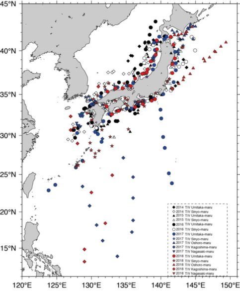 The picture shows microplastic observations conducted by Japanese researchers to date.