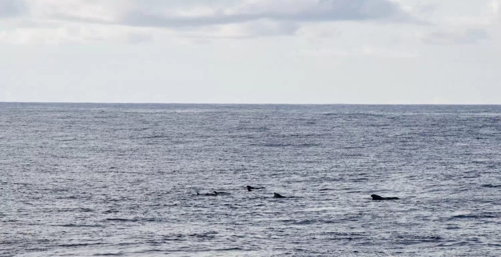 180 nautical miles from Honiara, our final destination, we were sailing along the southeast coast of the island of Makira. Christelle was on watch and called us to come and see several groups of tropical pilot whales. It was such a magical moment! We observed each other: us perched on the solar panels, they, raising their heads out of the water.