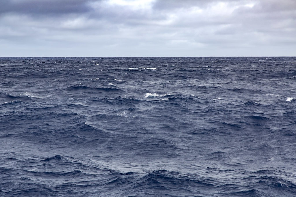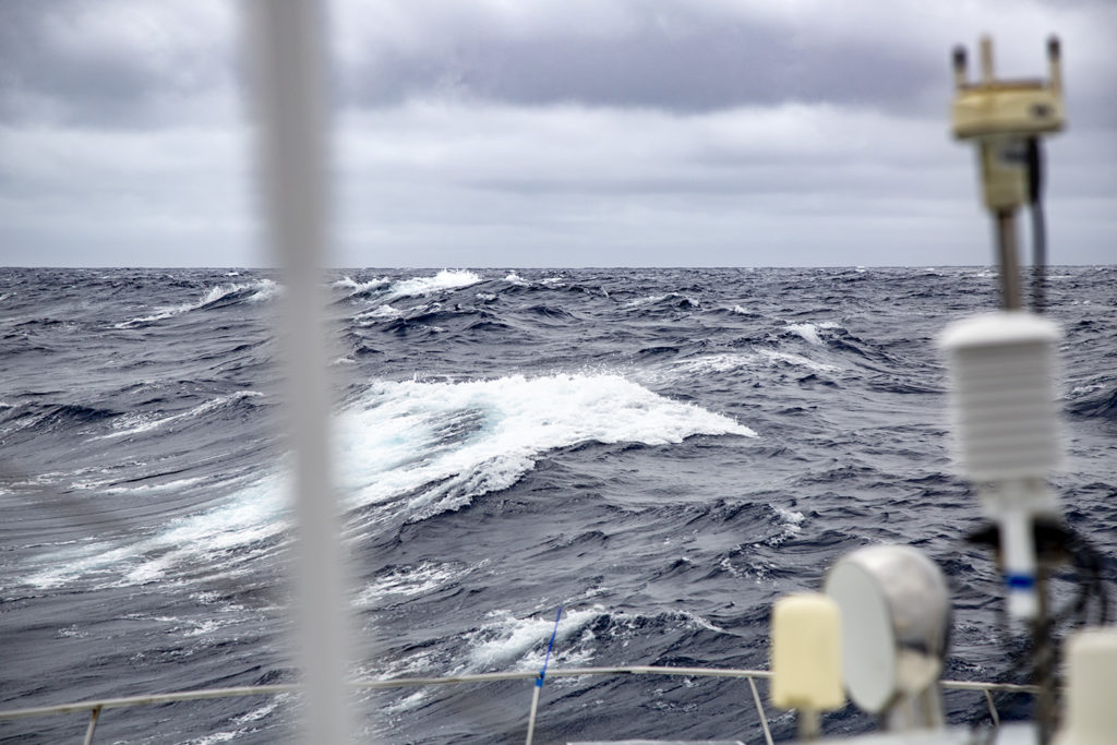 All of a sudden, at lunchtime, the wind and the sea simultaneously began to pick up. We went from windless conditions to 30 knots of breeze, from smooth seas to 2.5/3-metre waves. Our Race for Water is now pitching and rolling; the hull is growling and rattling. The storeroom is creaking and the fridges tinkling with all the little glass pots sliding around inside.