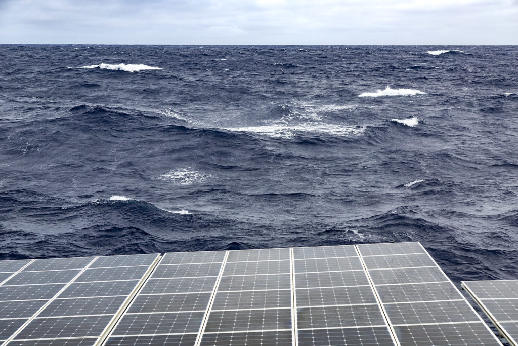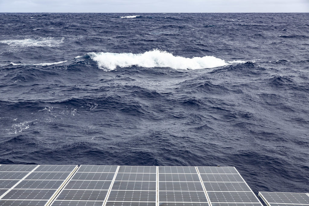 “It was shaping up to be a peaceful day: the sun has come out and the squalls were moving out of our way, as if somehow respectful of our quest for energy. The grib files were announcing windless conditions and hence there was little prospect of flying our kite, but as long as the sun was out we were felt quietly confident…