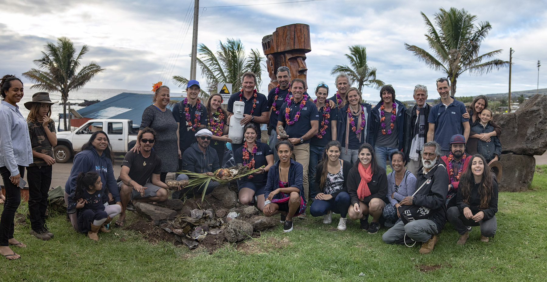 Après avoir été escorté par des pirogues jusqu’à son point d’amarrage, l’ équipage a été accueilli, comme le veut la coutume locale Rapa Nui, avec un Umu Haut – c’est-à-dire un poulet cuit dans la terre, symbole de la virginité des esprits. Il a été ensuite pourvu de colliers de fleurs.