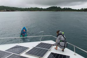 “Approaching a distant cape this morning, the sea took on a grey, leaden quality, keen to see the sky and the skyline merge into one. We crossed tacks with a lone fishing boat equipped with two Ecuadorian sailors, little specks of bright blue and yellow punctuating all this greyness. They’re busy working around a net, which they toss over the side without deigning to pay any attention to our spaceship silently slipping across their wake close to them.