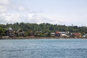 The closer we got, the lighter it became, dispelling the sense of mystery of this village and its scattering of low-lying houses with undulating rooves, protected from the oceanic onslaught by a kind of riprap, with a beach of palm trees extending out from it where a row of bright-coloured boats were lined up.