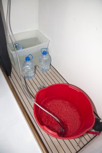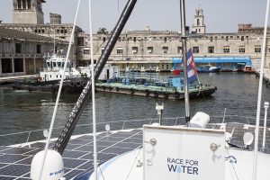 During our three-week stopover, Race for Water often had to move between the port and a mooring in the bay. But wait, there’s more: we couldn’t use the desalinator because the water is too dirty, and we could only get water from the barge when we were docked. Because the 500 liter tank isn’t enough for all of Race for Water’s needs for many days in a row, we had to fill up every available bucket and tub every time the barge came by—and even so, we had to keep our water use to a bare minimum. We all learned to bathe with a bucket and a dipper, we only ran the washing machine when the barge was filling the tank, and we loaded the dishwasher to the max. Everyone on board had to commit to this with no exceptions.