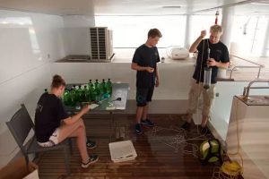 The Manta Net, which we trail behind the boat to collect sea water samples, probes for sediments, which are dropped to a depth of 20 metres at various pre-planned points and our captain accurately tracks them down again using the GPS. Everyone bustles about, the crew included, amidst the plethora of jars, test tubes and various bottles, with the 30 square metres of the aft deck (alias the Marina) transformed into a research lab, which is directly exposed to the ocean. In the afternoon, the trade wind kicks in, picking up short seas which hit us side on, upsetting certain stomachs that are unfamiliar with such treatment.