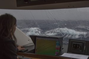 Steering Race for Water manually is an exercise in concentration. It’s not easy; she weighs 100 metric tons. We’re always trying to anticipate the path that she’ll take, and we really have to counter-steer when we get picked up by a wave. Even taking turns at the helm every 15-20 minutes, we’re pushed to the limit, going at over 10 knots on the waves.
