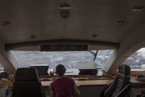 There was lots to organize inside Race for Water as well. We had to secure the tables and chairs, and stow everything else: computers, video and photo equipment, etc. Everything had to be prepared for the conditions, and we really didn’t have too many things bumping around inside the boat. One of the fridge doors came open, a coffee pot in the storeroom fell off the shelf, and down in the hold, a crate of carrots and one of the extra solar panels broke, but really nothing serious.