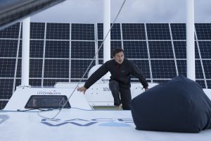 Fortunately we had time to get ready. It was the first time that we’d experienced those kinds of conditions on Race for Water, so we watched carefully to see how she behaved. We were totally focused. When the wind picked up, we had to retract the solar panel wings so that they didn’t smash into the waves as the seas got higher. At times, Race for Water listed hard enough that the wings were only an inch or so above the waves.