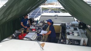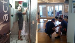 Following an Atlantic crossing, navigation between the hurricanes and 6 stopovers, it was high time to focus on improving and reviewing Race for Water! On-board with the Race for Water technicians right now: the teams from Swiss Hydrogen and Barrilec, a company working on electrotechnology on warships in Lorient. “On-board, they’re busying themselves with the electronics connections and the handling of the hydrogen system. These two companies comprise highly efficient people with a huge amount of advanced skills”, comments Jean-Marc Normant, chief operations officer. Thus far, the hydrogen system has always been in its test phase, without being connected to the vessel due to a lack of certification. “In this way, the connecting up of the systems will enable us to test them in situ so as to testify to their performance”, explains Jean-Marc Normant. The next stage? Simulations of the electrolysers are planned for the end of this week.
