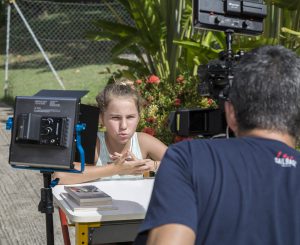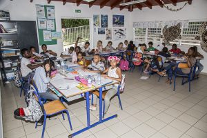As we creep into this little school enveloped in lush greenery, someone tells us where we can find the class. Having barely set foot inside, Peter unpacks his gear, sets up his video camera and films the children. There isn’t a sound and the children look at us in stunned amazement, slightly uncomfortable about this morning intrusion. Midway through her lesson on ‘marine advice’, the teacher smiles and then explains how the lesson will play out: “Twice a week, we discuss the action we wish to undertake on our beach in order to preserve this fragile ecosystem”, explains Yanni Bardail, Director of the school and Head of the class.